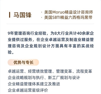 美国Moruo精益设计咨询师美国SBTI精益六西格玛黑带9年管理咨询行业经验,为8大行业共计40余家企业提供过服务,在企业卓越运营及制造业精益管理咨询及企业规划设计方面具有丰富的实战经验。优势与专长:卓越运营、经营绩效管理、管理变革、流程变革企业战略规划与执行、新工厂规划与设计企业精益管理体系建立及推进企业卓越运营星级评价行业经验:机械、电子、家电、太阳能、钢铁、铝业化工、医疗器械、医药商超、快递快运汽车、航天、半导体